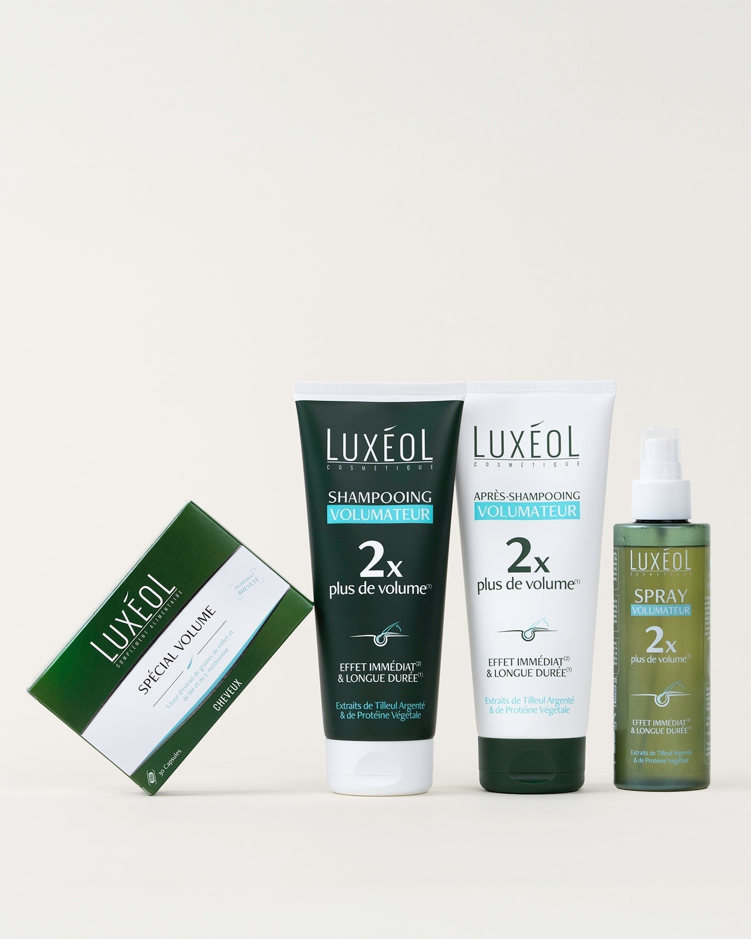Le Protocole Volumateur (shampooing, après-shampooing et spray volumateur) complète l’action en nettoyant et en apportant vitalité à la fibre capillaire sans l’alourdir.